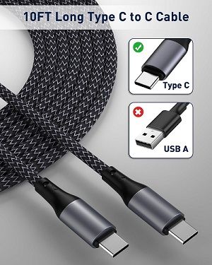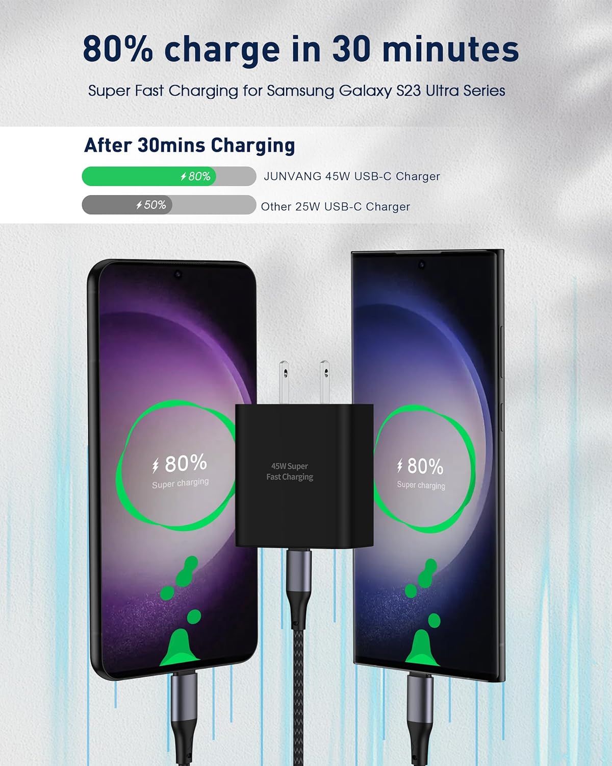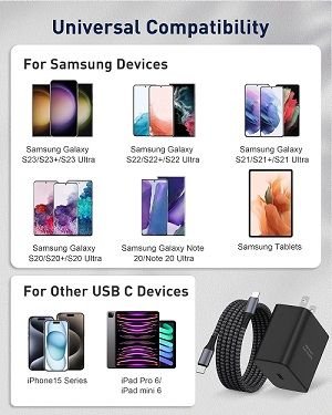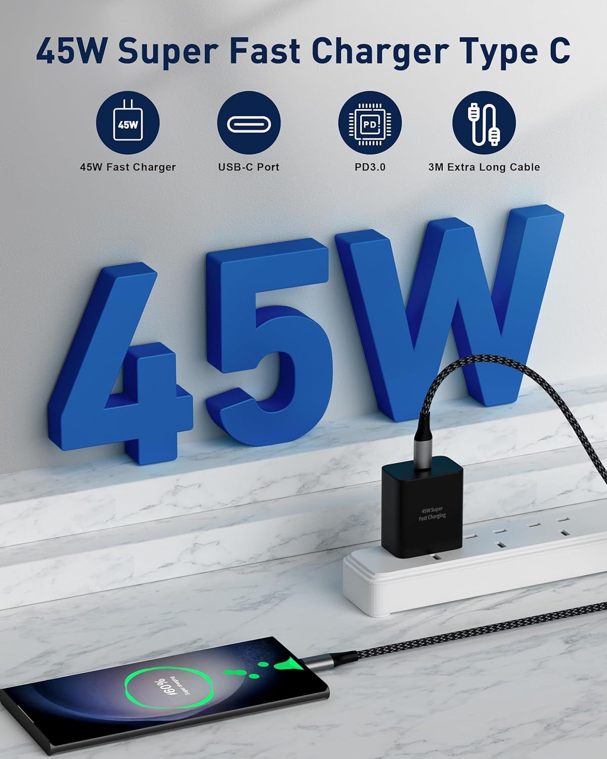 【45W Super Fast Charger】 45W USB C super fast charger provides compatible Samsung devices with maximum power of 45W, charge for Samsung Galaxy S22/S23 Ultra from 0% to 50% in just 20 min, full charge only takes less than 1 hour; Also provides full speed charging for other devices that support USB-C fast charging technology. 【10FT Extra Long Cable】 With 10ft extra long USB C to C cable, lets you worry-free charging your Samsung phones or tablets from any occasions like on sofa, bed, office in long distance, up to 480Mbps data transfer speed. Strong braided nylon material makes it 5x durable for longer use. Proven in strict laboratory settings to withstand up to 20000+ bends. 【Widely Compatible】 45W Super fast type c wall charger compatible with Samsung Galaxy S23/ S23 Plus/ S23 Ultra 5G, S22/ S22+/ S22 Ultra 5G, S21/ S21+/ S21 Ultra 5G/ S21 FE, S20/ S20+/ S20 Ultra 5G/ S20 FE 5G, S10/ S10+/ S10e, Note 20/ Note 20 Ultra 5G, Note 10/ Note 10+, Note 9, Note 8, S9/S9 Active, S8/S8+/S8 Active, Z Fold 2/ 3/ 4, Z Flip 1/ 3/ 4, iPad (10th), iPad Pro 12.9/11 (3/4/5/6th), iPad Air (4/5th), iPad mini (6th), Google Pixel 7a/7/7 Pro/6/6 Pro/5/4/3. 【Safe & Reliable】 45W Type C fast charging block built-in multiple security protection system and intelligent IC identification technology to prevent against short circuit, over-current, over-voltage, over-heating and over-charging. It can intelligently recognize the battery type and status, will automatically stop charging when fully charged for a safety charging and long lifespan. 【What You Get】 1x 45W Fast USB C Wall Charger Block, 1x 10FT USB C to USB C Charging Cable.