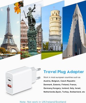 [Universal Travel Plug Adapter] Universal travel plug adapter travel essentials to most European countries such as Austria, Belgium, Czech Republic, Denmark, Estonia, Finland, France, Germany, Hungary, Iceland, Italy, Israel, Netherlands, Spain, Turkey, Switzerland. (Note: Not work in UK/Ireland/Scotland) [20W Dual Port Fast Charger] European charger block equipped with a USB-C port and USB-A port, can charge 2 devices simultaneously. Fast Charge your iPhone 15 from 0% to 50% in just 30 minutes. [Universal Compatibility] Universal power adapter is 100-240 Volt input ideal for worldwide trip, compatible with iPhone 15/15 Plus/15 Pro/15 Pro Max, iPhone 14/14 Plus/14 Pro/14 Pro Max/13/12/SE/XR/XS, iPad, AirPods, Samsung Galaxy S24/S23/S22, Google, LG and more. [Safe & Reliable] European travel plug adapter equipped with multiple security protection system, including over-heat protection, over-current protection and short circuit protection. [What You Get] 1-Pack European Travel Plug Adapter 20W Dual Port Wall Charger Block.