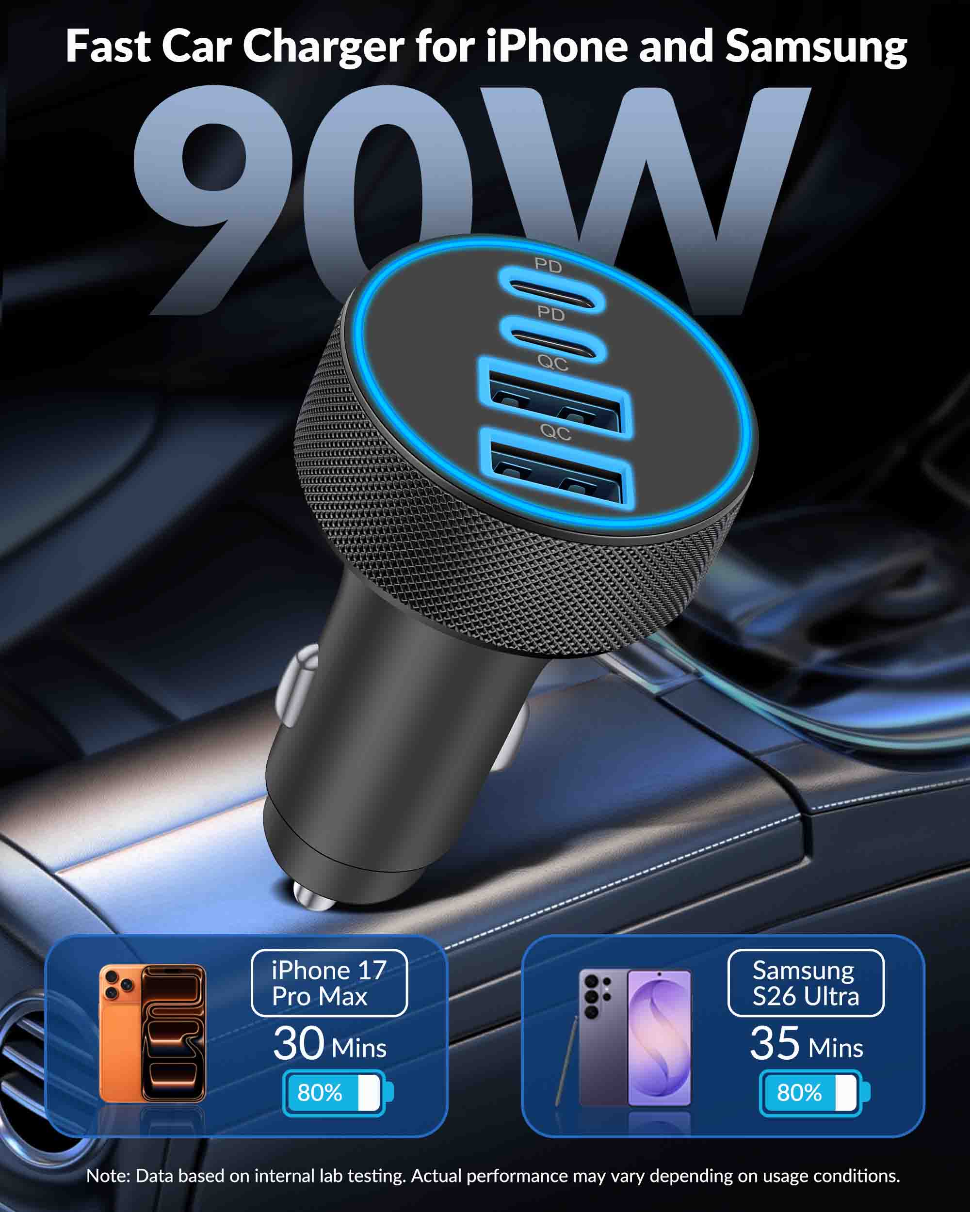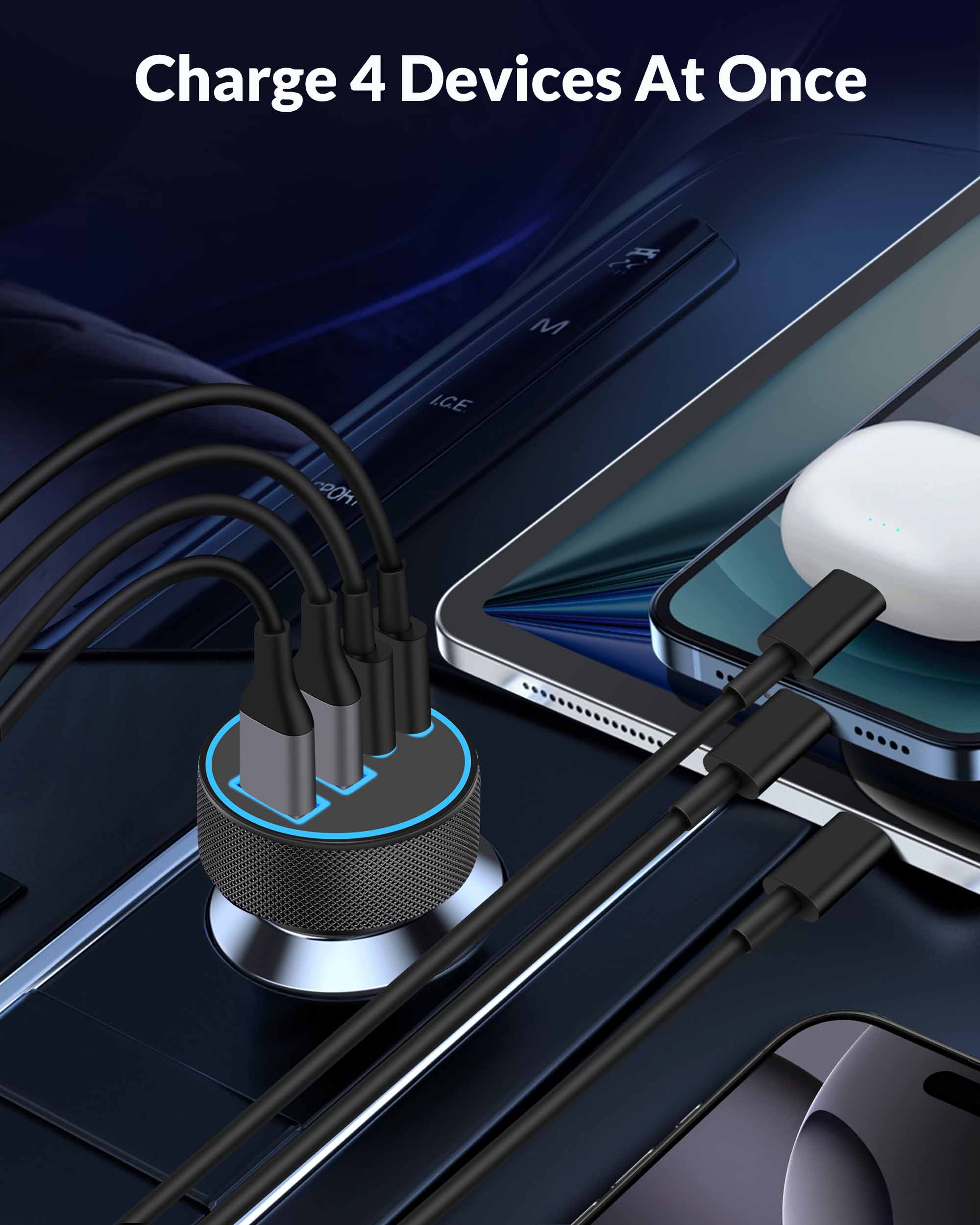 iPhone 17 16 15 Car Charger Fast Charging, 90W 4-Port USB C Fast Car Charger Cigarette Lighter Adapter with 240W 3FT USB-C Cable for iPhone 17/Air/17 Pro/17e/16/15 Pro Max/Plus/16e, iPad, Android