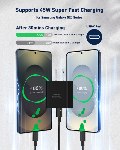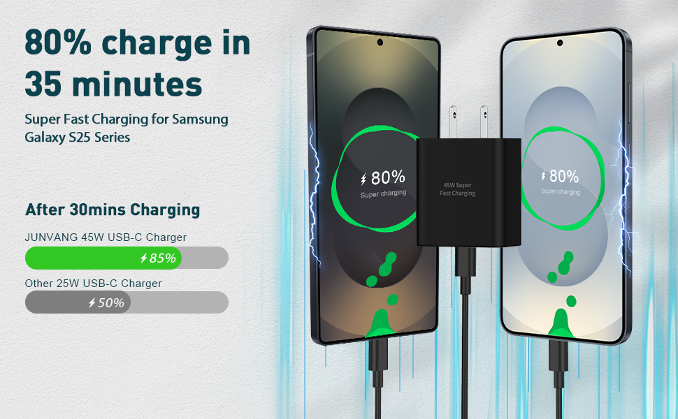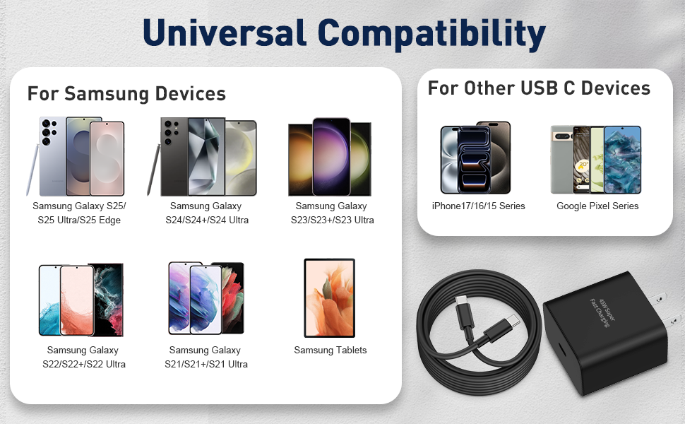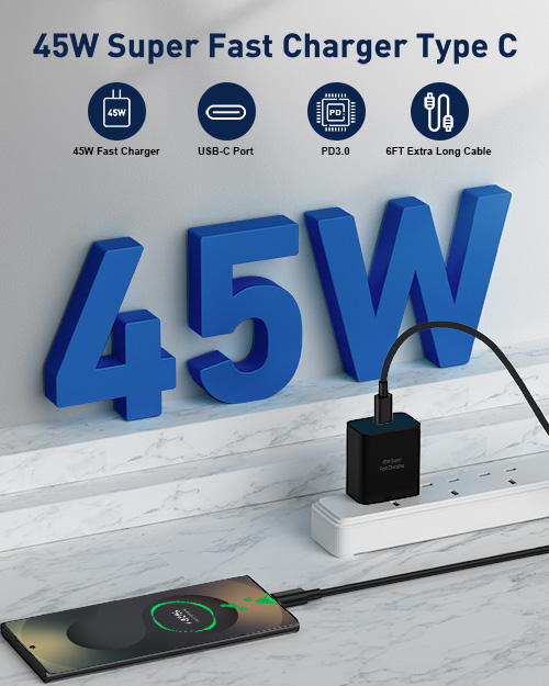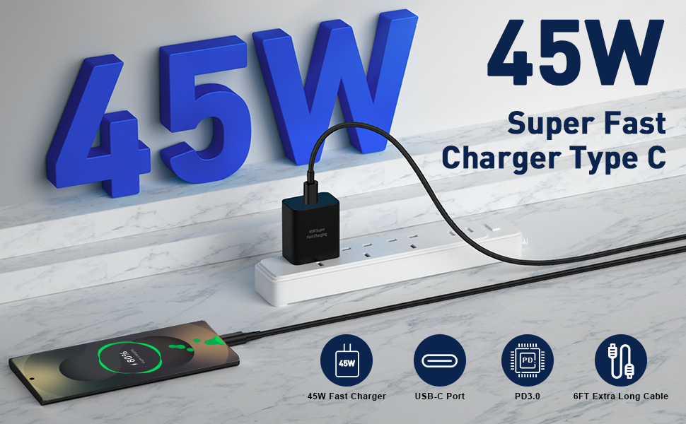 Manufacturer:Heyuan Chenchuang Technology Co., Ltd Model:A9T45C Amazon Launch Day:2025-10-09 45W Fast Charger for Samsung Devices: The USB C fast charger with PPS and PD 3.0 technology for the Samsung Galaxy devices boasts a maximum output power of 45W and can charge for Samsung Galaxy S25/S24 and more Android devices up to 80% within 30 minutes, filling up your phone as quickly as possible in a short time 3-Pack 6FT Type C Charger Cord: Paired with a USB C to USB C fast Charging Cable that supports a maximum output power of 60W and data transfer can reach up to 480Mbps, 1G files will be transferred within 30s. 6FT Long cable is durable and convenient for daily use. 60W 6FT cable offer fast, efficient charging at home, in the office, or on the go Safe & Reliable: The 45w type c charger uses an intelligent on-board power management chip to provide multiple high-performance security protections, including over-current, over-voltage, overload, and short circuit protection, ensuring fast and lasting charging without overheating. It will automatically stop charging when fully charged for safety charging and more long lifespan Widely Compatibility: The 45W Fast Charger USB-C compatible with Samsung Galaxy S25 Ultra/ S25+/S25/S25 Edge/S24 Ultra/S24+/S24/S23 Ultra/S23+/S23, S22 Ultra/S22+/S22/S21 Ultra/ S21 /S21+/S20 FE 5G, Note 20 /10 Ultra, Z Fold7/6/5/4, Z Flip7/7 FE/6/5/4, A56 5G/A55 5G/A54 5G / A53 5G, W25/W25 Flip/W24/W24 Flip/W23/W23 Flip, Galaxy Tab S11 Ultra 5G/S11/S10 Ultra / S10/S9 FE /S8/S7/S6, Android Phones, and more USB-C devices What You Get: 3 x 45W Type C Fast Charger USB C, 3 x 6FT 60W USB-C to USB-C Charging Cable. Compatible with Samsung and Android series, it offers flexible charging options for Samsung Galaxy multi device users. For any questions or concerns, our professional and friendly customer service team is here 24/7 to prompt support