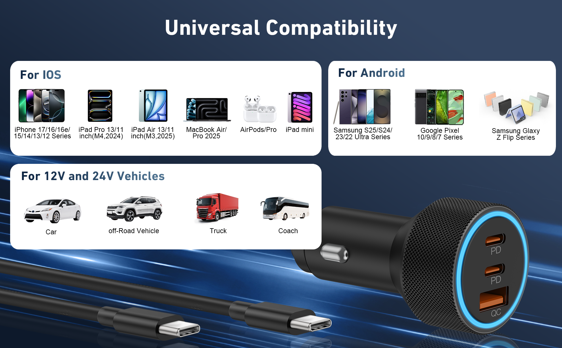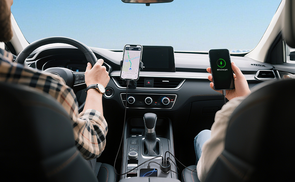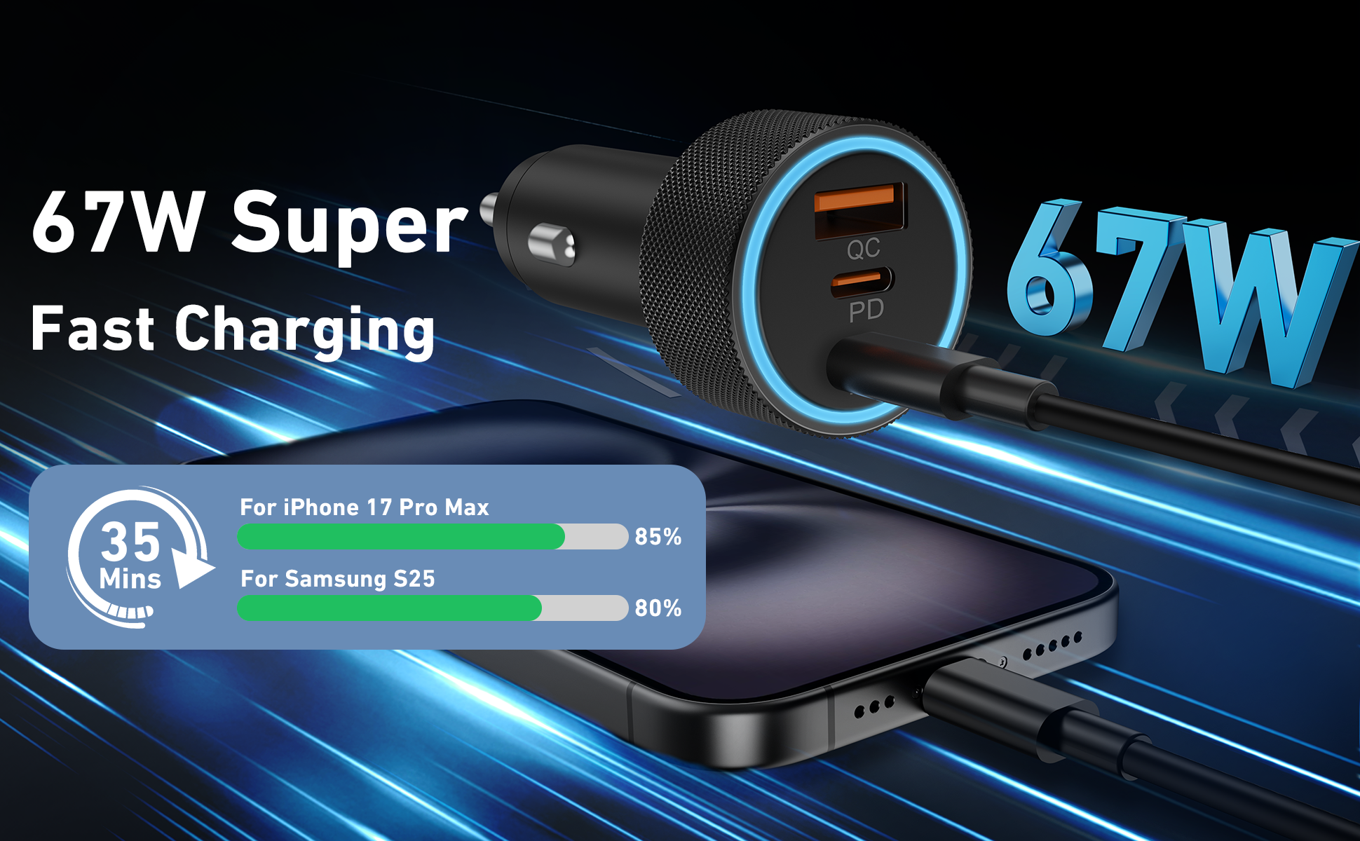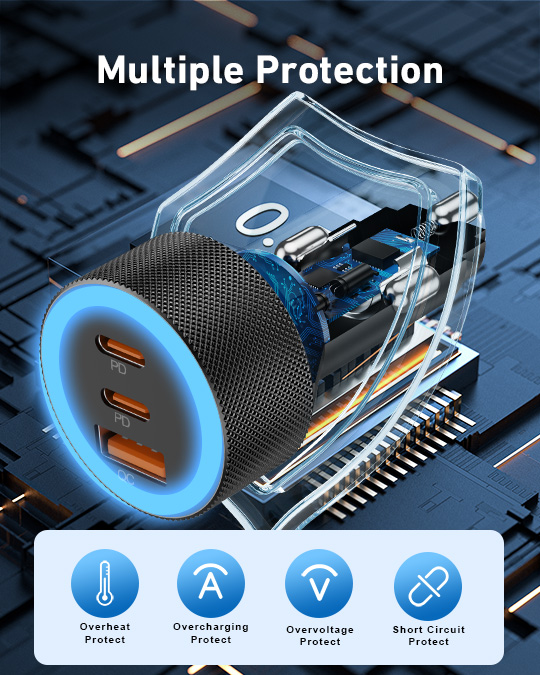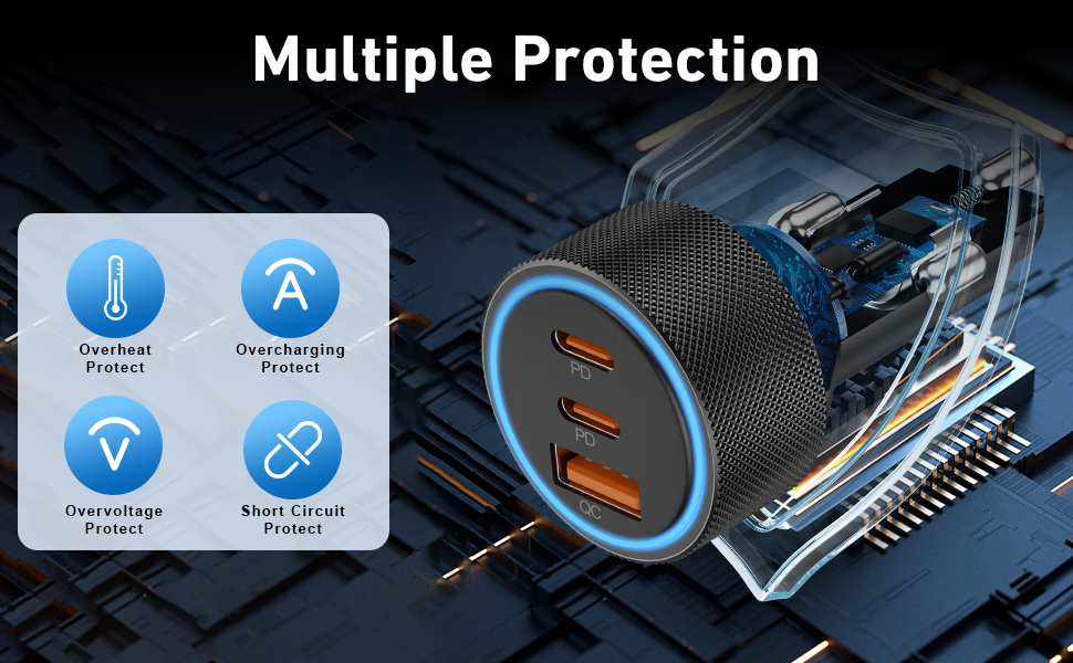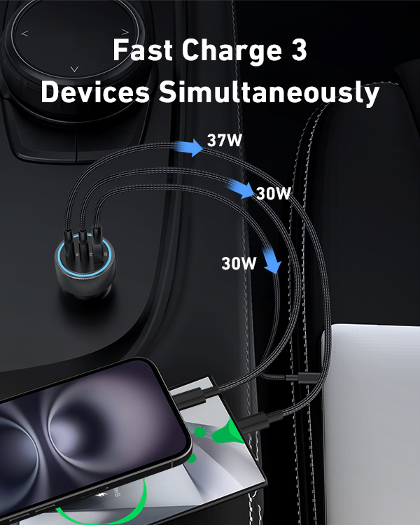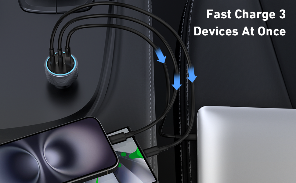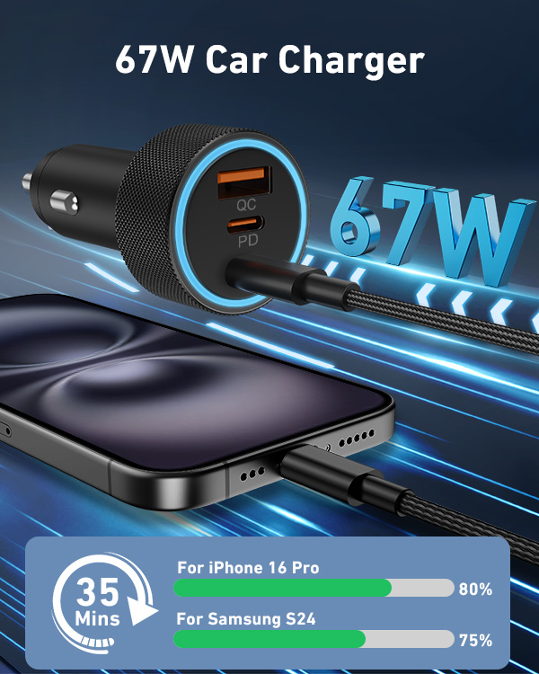 Universal Compatibility: 3-Port 67W Fast USB C car charger adapter compatible with Samsung Galaxy S25 Ultra/S25/S25+/S24/S24 Ultra/S24+/S23/S23 Ultra/S23+/S23 FE/S22/S21/S20, Galaxy Z Flip 5/Z Fold 5/Z Flip 4/Z Fold 4/W24/W23, Note 20/10, iPhone 17/17 Pro Max/17 Pro/Air/16/16 Plus/16 Pro/16 Pro Max/iPhone 15/15 Plus/15 Pro/15 Pro Max, iPad Pro 12.9/11 inch, iPad Air 5/4, iPad Mini 6, iPad 10th, MacBook Pro, AirPods, Google Pixel 10/10 Pro/10 Pro XL/10 Pro Fold/9/9 Pro/9 Pro XL/9 Pro Fold/8/8 Pro/7/7 Pro/7a/6/6 Pro/ 6a /5/5a/4/4a/4 XL, Google Chromebook Pixel, Android Phones and more 67W PD&QC Fast Charging: 67W Type C Car Charger an provide super fast charging for iPhone/iPad/Samsung Devices. The 37W PD port can provide fast charging for your iPhone 15/14 from 0% to 80% in 30 minutes, and fully charged Samsung Galaxy S25/S24/23 Ultra in 1 hour. The 30W QC port can also high-speed charge most USB-A devices 3-Ports Simultaneous Charging: The USB C car charger charge up to three devices at once with a total output of 67W using the two USB-C ports and one USB-A port. When all 3 devices are connected, the USB-C 1 port delivers 37W of power through PPS / PD fast charging Safe & Reliable: The super fast car charger adapter built-in intelligent circuit design protects against short circuiting, protects devices from over-heating, over-current, over-charging and short circuits. Blue LED ambient light makes it easy to find the charging ports in the dark What You Get: 1-Pack 67W 3-Ports USB C Car Charger Adapter, 1-Pack USB C Cable