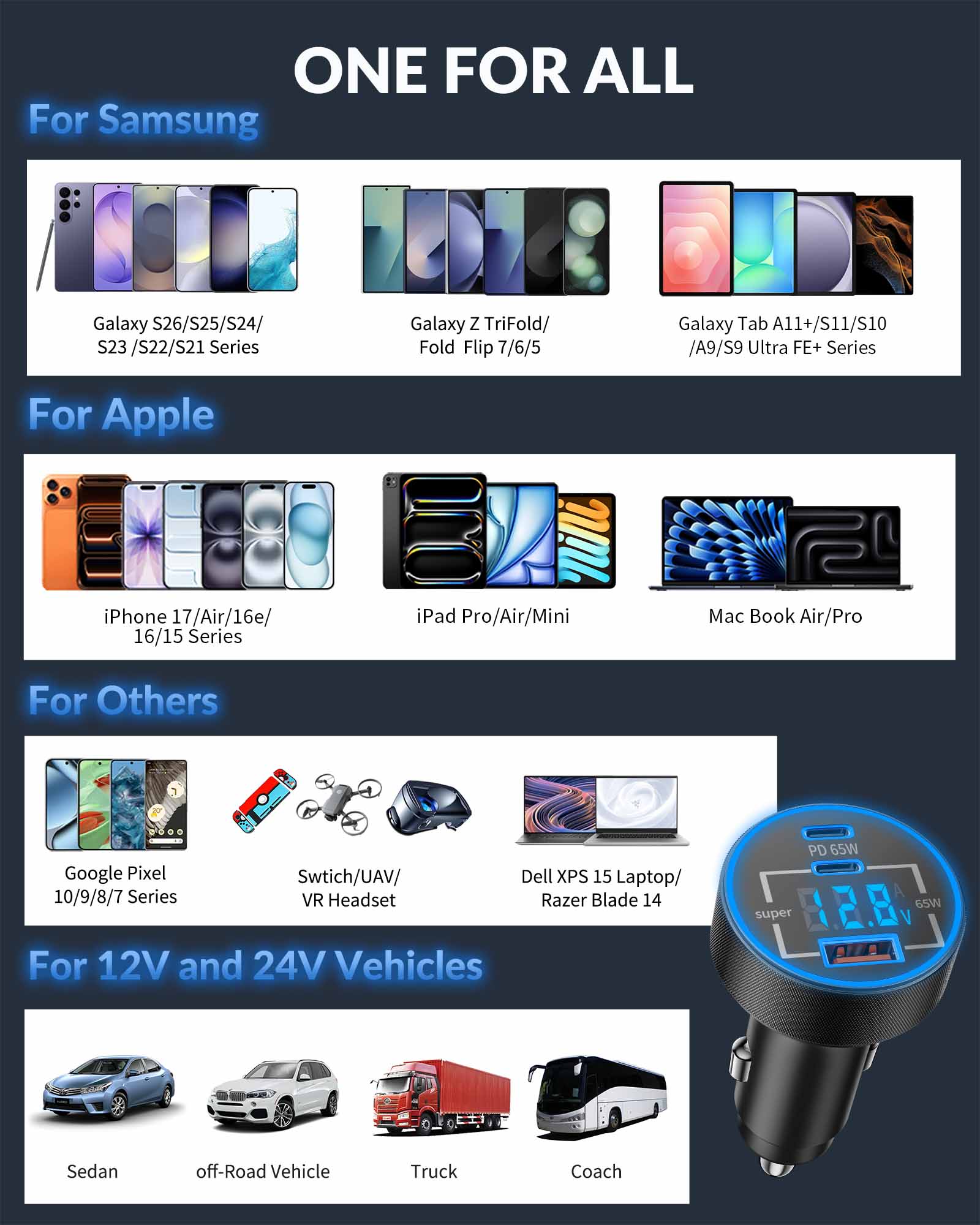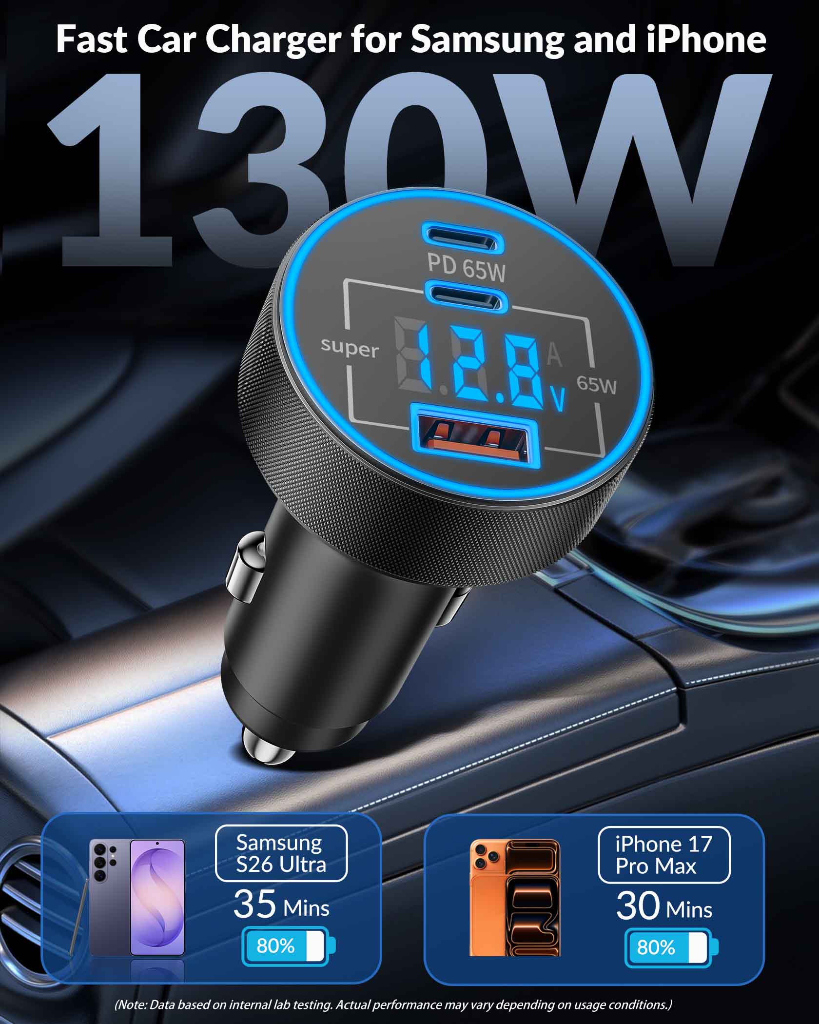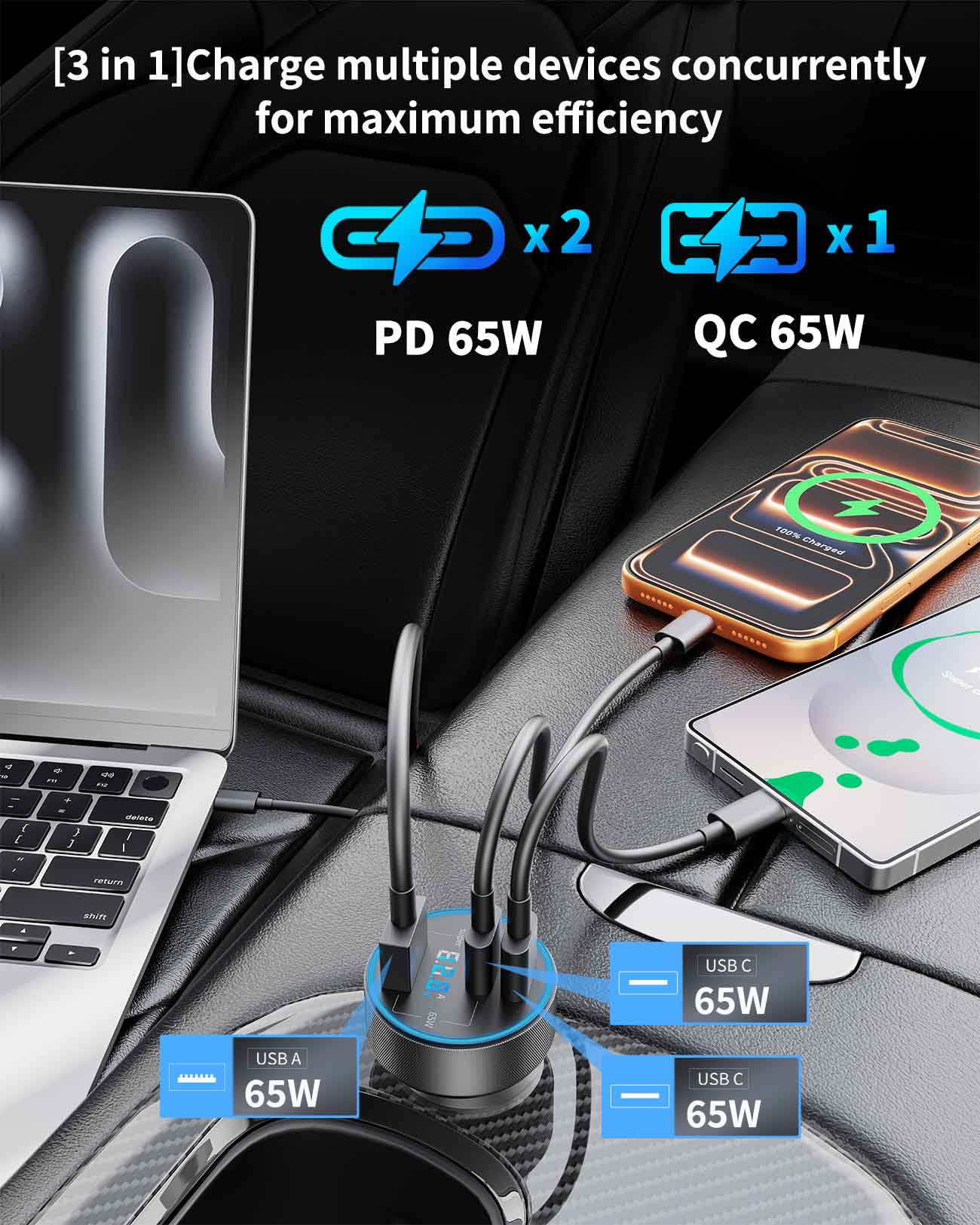 Manufacturer:Heyuan Renzhi Technology Co., Ltd. Model:QK130X Amazon Launch Day:2026/2/26 3 Ports 130W Super Fast Car Charger: USB C car charger power adapter accesorios para carro with all-new upgrade PPS / PD / QC super fast charging technology of 130W can charge for Samsung Galaxy S26/S25/S24/S23 Ultra series up to 80% and iPhone 17/17e/16/15 series up to 70% in 30 minutes. Equipped with 2 USB-C ports and 1 USB-A port, charge up to 3 devices simultaneously (including phones, tablets and driving recorder). The intelligent power distribution automatically adjusts output to ensure fast and efficient charging for all your devices Car Charger with Real-Time Voltage Monitor: The car charger is equipped with an LED digital display voltmeter, you can monitor and display the voltage of the car battery in real time, thereby quickly grasping the operating condition of the car's electrical system. This enables you to take timely measures to avoid possible faults during driving and eliminate potential safety hazards in advance. internal smart chip offers multiple protections against overcharge, overheating, and short circuits, ensuring fast and safe charging for connect device 240W Ultra Fast Charging USB C Cable: This 240W USB C to C Cable Cord supports the highest power transmission in the PD 3.0/PD 3.1 standards. It can supply power from 240W gaming laptops to 20W wireless headphones, suitable for various USB-C devices ranging from large to small (240/200/140/100/60/45/30/20W) and refreshes the fast-charge record now. Equipped with an E-Marker chip, it intelligently protects your devices from overcharging, overheating and battery damage, ensuring safe and efficient charging for all your USB-C gadgets Widely Compatibility: 130W Type C super fast car charger USB C Compatible with Samsung Galaxy S26 Ultra /S26+ /S26 /S25 /S25+/S25 Ultra/S25 Edge/S24/S24+/S24 Ultra/S24 FE/S23/S23+/S23 Ultra/S23 FE/ S22/S22+/S22 Ultra, Z TriFold/Z Flip 7/Z Flip 7 FE /Z Fold 7, Z Fold 6/Z Flip 6, Z Flip 5/Z Fold 5, Z Flip 4/Z Fold 4, Note 20/10/9, W26/W25/W24, A56/A55/A54/A53, iPhone 17/17e/Air/16/15/Pro Max /Plus, iPad Pro/Air/Mini, Mac Book Pro/Air, Pixel 10/9/8/7/6 Pro XL, LG, Moto, Tablets, Android Phones, GPS Navigation. Compatible with 12V–24V Cars, Trucks, SUVs, RVs and more What You Get: 1 x 130W 3-Port USB C Car Charger Power Adapter (with Voltage Display ), 1 x 240W 3FT USB C to USB C Fast Charging Cable. This portable car phone charger accesorios para carro is ideal for travel essentials, streamers, gamers, and professionals who need to multiple high-power devices in the car. It is an excellent fast car charger for your road trip. If you have any questions, please feel free to contact us. We offer 24/7 customer service to solve any charging issues