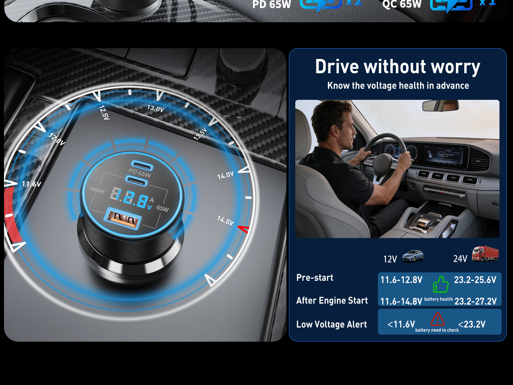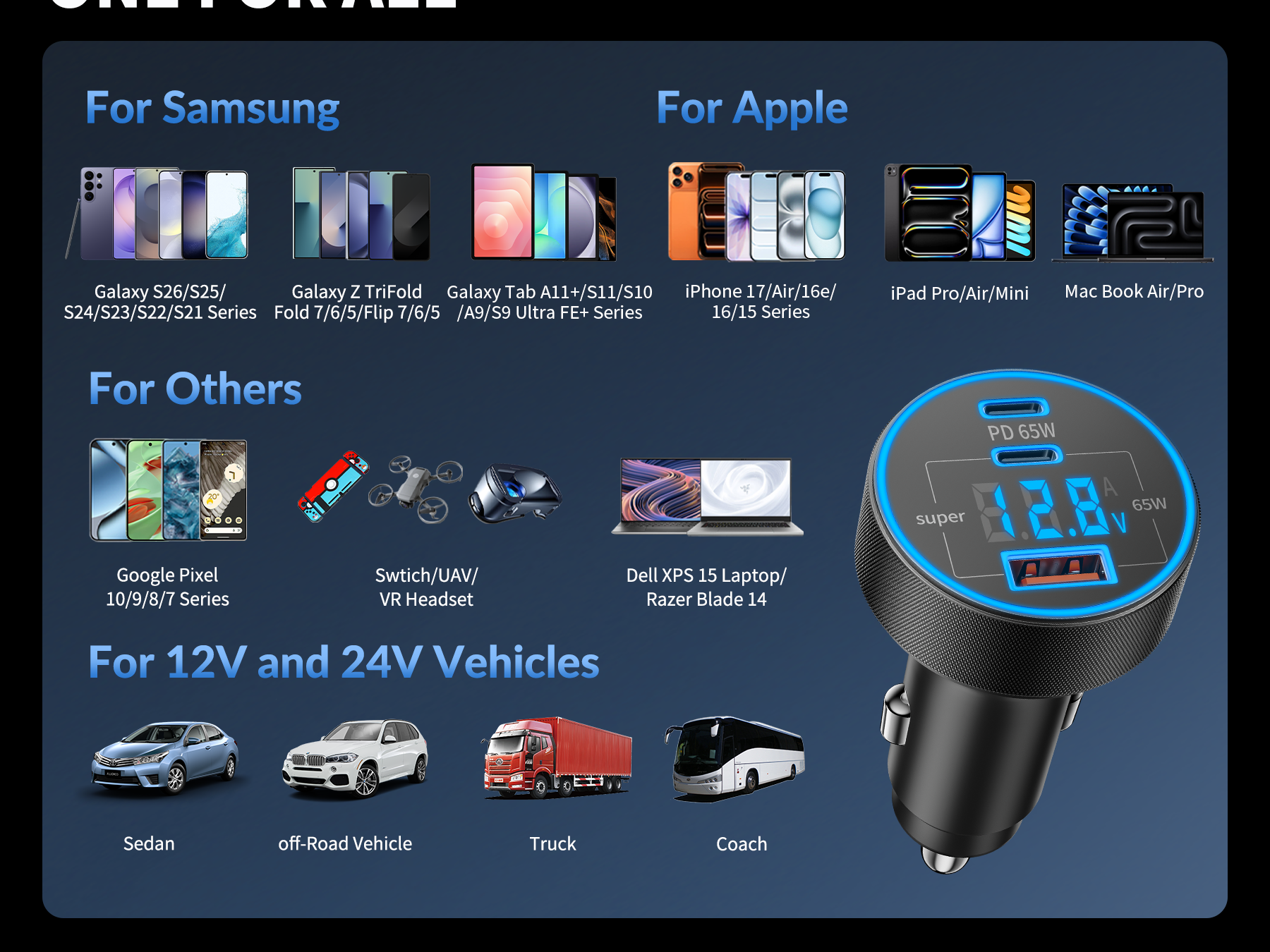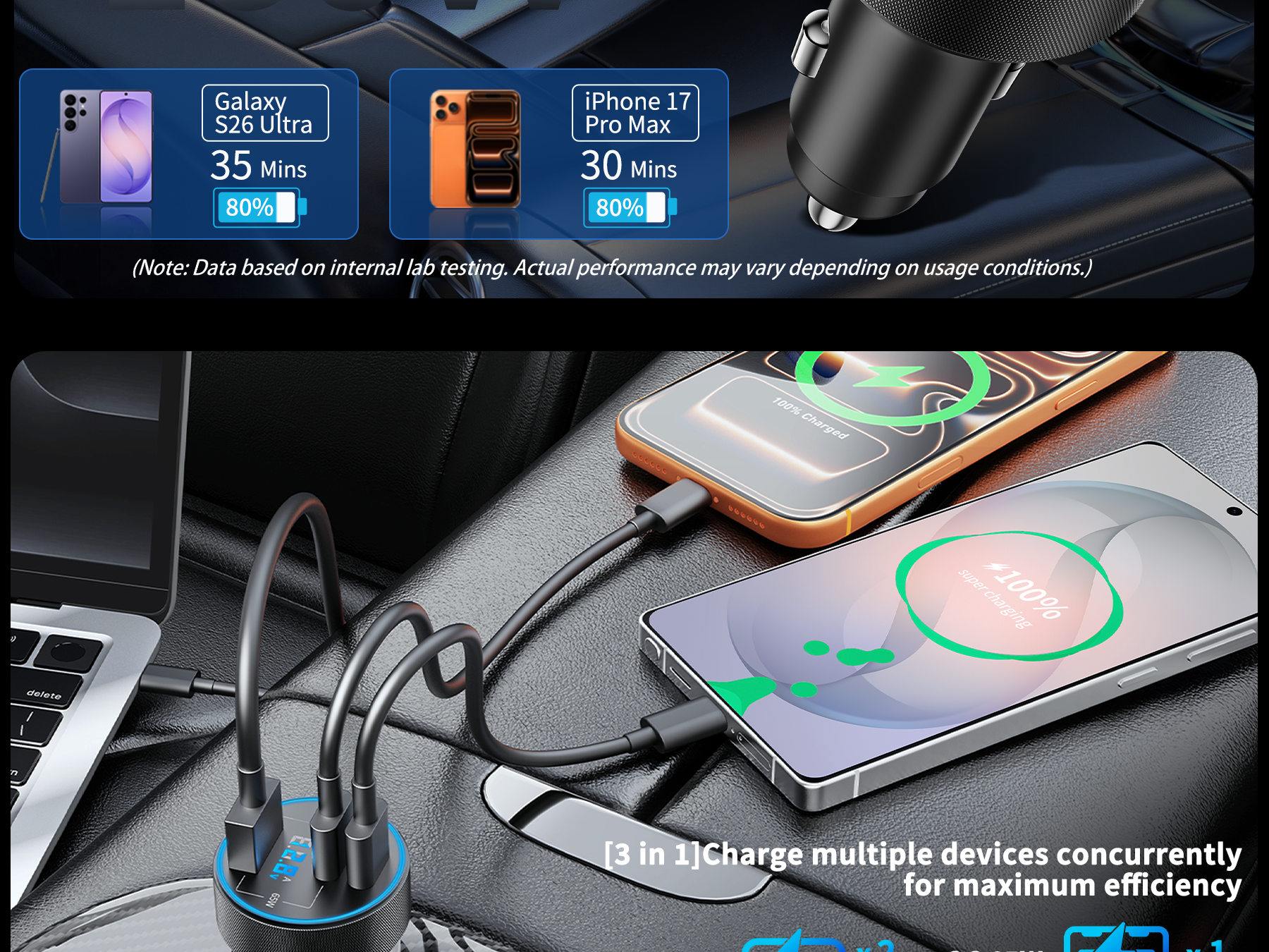 Manufacturer:Heyuan Renzhi Technology Co., Ltd. Model:QK130X Amazon Launch Day:2026/2/26 3 Ports 130W Super Fast Car Charger: USB C car charger power adapter accesorios para carro with all-new upgrade PPS / PD / QC super fast charging technology of 130W can charge for Samsung Galaxy S26/S25/S24/S23 Ultra series up to 80% and iPhone 17/17e/16/15 series up to 70% in 30 minutes. Equipped with 2 USB-C ports and 1 USB-A port, charge up to 3 devices simultaneously (including phones, tablets and driving recorder). The intelligent power distribution automatically adjusts output to ensure fast and efficient charging for all your devices Car Charger with Real-Time Voltage Monitor: The car charger is equipped with an LED digital display voltmeter, you can monitor and display the voltage of the car battery in real time, thereby quickly grasping the operating condition of the car's electrical system. This enables you to take timely measures to avoid possible faults during driving and eliminate potential safety hazards in advance. internal smart chip offers multiple protections against overcharge, overheating, and short circuits, ensuring fast and safe charging for connect device 240W Ultra Fast Charging USB C Cable: This 240W USB C to C Cable Cord supports the highest power transmission in the PD 3.0/PD 3.1 standards. It can supply power from 240W gaming laptops to 20W wireless headphones, suitable for various USB-C devices ranging from large to small (240/200/140/100/60/45/30/20W) and refreshes the fast-charge record now. Equipped with an E-Marker chip, it intelligently protects your devices from overcharging, overheating and battery damage, ensuring safe and efficient charging for all your USB-C gadgets Widely Compatibility: 130W Type C super fast car charger USB C Compatible with Samsung Galaxy S26 Ultra /S26+ /S26 /S25 /S25+/S25 Ultra/S25 Edge/S24/S24+/S24 Ultra/S24 FE/S23/S23+/S23 Ultra/S23 FE/ S22/S22+/S22 Ultra, Z TriFold/Z Flip 7/Z Flip 7 FE /Z Fold 7, Z Fold 6/Z Flip 6, Z Flip 5/Z Fold 5, Z Flip 4/Z Fold 4, Note 20/10/9, W26/W25/W24, A56/A55/A54/A53, iPhone 17/17e/Air/16/15/Pro Max /Plus, iPad Pro/Air/Mini, Mac Book Pro/Air, Pixel 10/9/8/7/6 Pro XL, LG, Moto, Tablets, Android Phones, GPS Navigation. Compatible with 12V–24V Cars, Trucks, SUVs, RVs and more What You Get: 1 x 130W 3-Port USB C Car Charger Power Adapter (with Voltage Display ), 1 x 240W 3FT USB C to USB C Fast Charging Cable. This portable car phone charger accesorios para carro is ideal for travel essentials, streamers, gamers, and professionals who need to multiple high-power devices in the car. It is an excellent fast car charger for your road trip. If you have any questions, please feel free to contact us. We offer 24/7 customer service to solve any charging issues