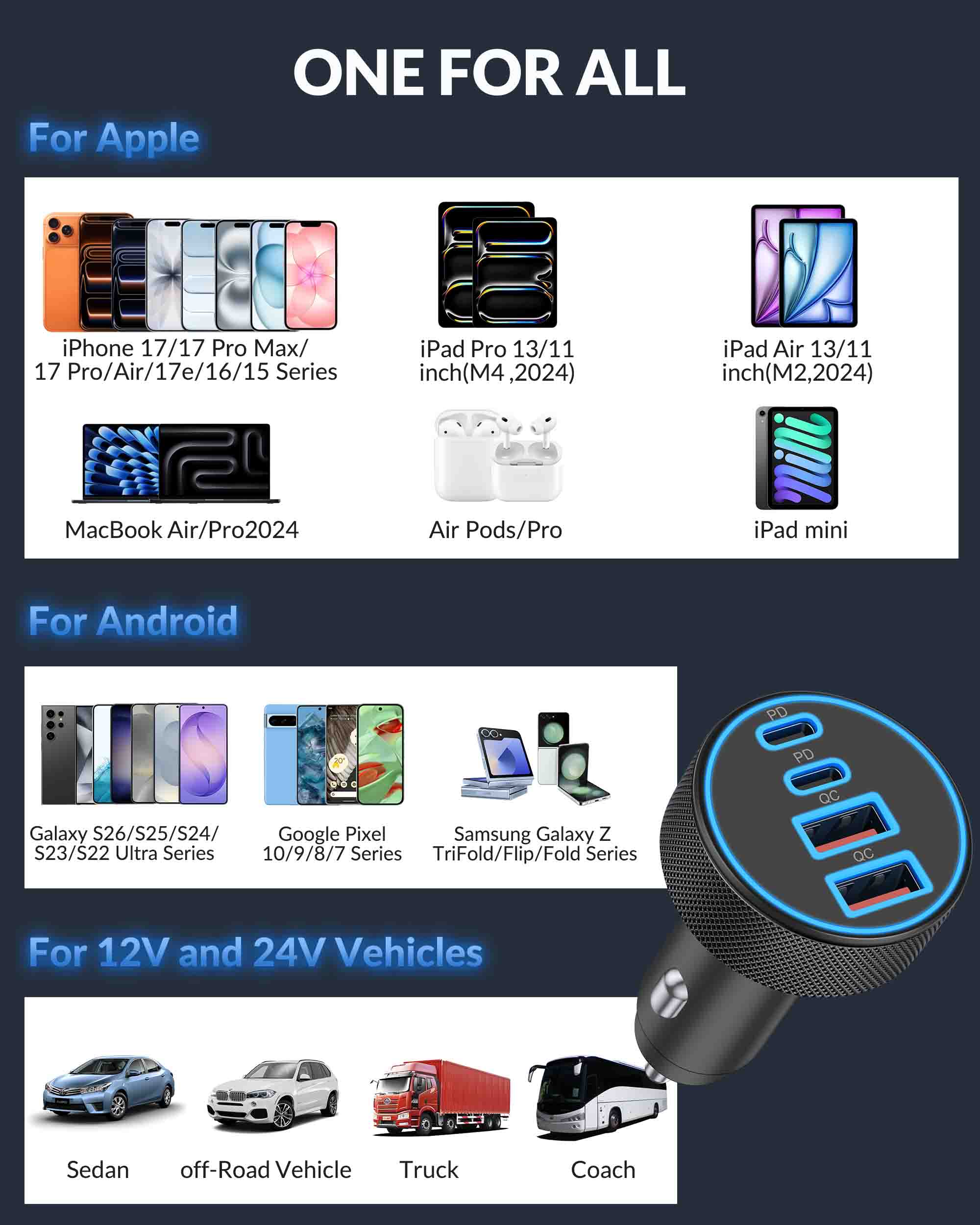 Manufacturer:Heyuan Renzhi Technology Co., Ltd. Model:R24-207LH Amazon Launch Day:2025-11-20 90W Fast Charging: USB C car charger adapter with all-new upgrade PD/QC super fast charging technology of 90W can charge for iPhone 17/17e/16/15/14/13/12 series up to 80% and iPad series up to 60% in 30 minutes. And also support PPS/PD super fast charge for Samsung Galaxy S26/S25/S24/S23 series up to 80% and most Android devices up to 70% in 35 minutes [4 in 1] 4-Port Car Charger: Car phone charger supporting PD 45W(Max) and QC 45W(Max) high output, can fast charge all prevailing cell phones and E-devices. This cigarette lighter adapter features 4-ports (2 USB-C and 2 USB-A ports) allows charging 4 devices simultaneously Widely Compatibility: 90W 4-Port Car charger accessories fits for all USB-C & USB-A devices, compatible with iPhone 17/17e/Air/16e/16/15/14/13/12/11/Pro Max/XS/XR/X/SE, iPad Pro/Air/Mini, Samsung Galaxy S26 Ultra/S26+/S26/ S25/S24/S23/S22/S21/S20/Ultra, Google Pixel 10/9/8/7/6/5/4 XL, Moto, LG, Android, Tablets, Laptop, Power Banks, Camera, Driving Recorder, GPS Navigation, and more Safe & Reliable: The type c car charger uses an intelligent on-board power management chip to provide multiple high-performance security protections, including over-current, over-voltage, overload, overheat and short circuit protection, ensuring fast and lasting charging without overheating. High-density all-metal housing helps dissipate heat during charging What You Get: 1 x 90W 4-Port USB C Car Charger Fast Charging, Compatible with 12-24V Cars, Trucks, SUVs, Pickup Truck, etc. Road Trip Essentials Car Accessories for Men Women